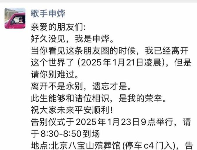 讣告以其简练而深情的文字表达,每一个字、每一句话都深深触动了人们的心灵:“离别并不意味着永远的分离,唯有遗忘才是真正的意义。能在这一生中与各位结识,对我来说是一种荣誉,祝愿大家未来一切顺利和平安。”申烨在讣告中不仅包含了这段真诚的言辞,还仔细地注明了追悼会的具体地点和可以联系的具体时间。令人震惊的事实是,预定的联系日期直到1月22日的18点才结束,而她在1月21日的凌晨已经去世。从这一点可以推断,很可能是她的亲密朋友或父母负责了追悼会的相关事务。尽管这篇讣告是由申烨本人编写的,但很有可能是她的家人发布的。这样的安排不仅展示了申烨对于生与死的宽容态度,同时也反映了她对未来事件的深思熟虑。