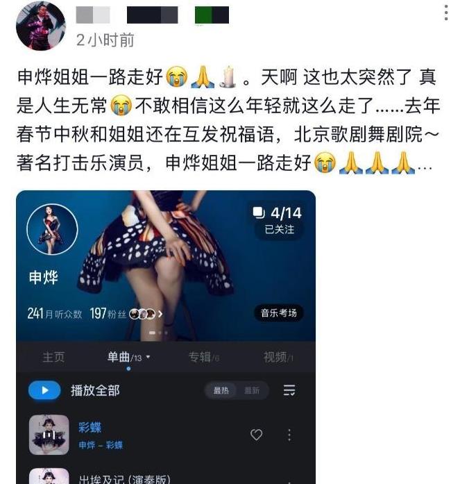 在1月21日的夜晚,一个令人震惊的坏消息笼罩了整个娱乐界,年仅40岁的民乐歌手申烨选择了永远地离我们而去。这名怀揣着音乐理想、容貌出众的女歌手,以一种触动人心的方式,与这个世界告别,勇敢地面对生与死,同时也给每一个前来道别的亲密朋友带来温暖。