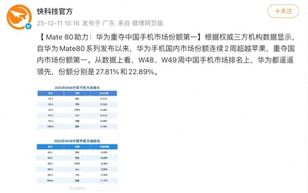 根据权威三方机构数据显示,自华为Mate80系列发布以来,华为手机国内市场份额连续2周超越苹果,重夺国内市场份额第一。