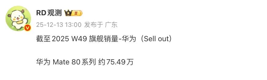 上个月,华为Mate80系列正式发布上市。随着新机开售,华为的销量表现也更进一步。