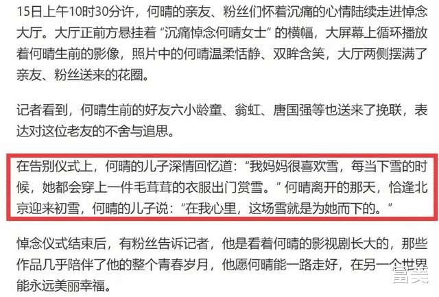 何晴儿子许何回忆,母亲生前喜爱雪景,每当下雪总会特意出门赏雪。恰在何晴离世之日,北京迎来初雪。许何说:“在我心里,这场雪就是为她而下的。”