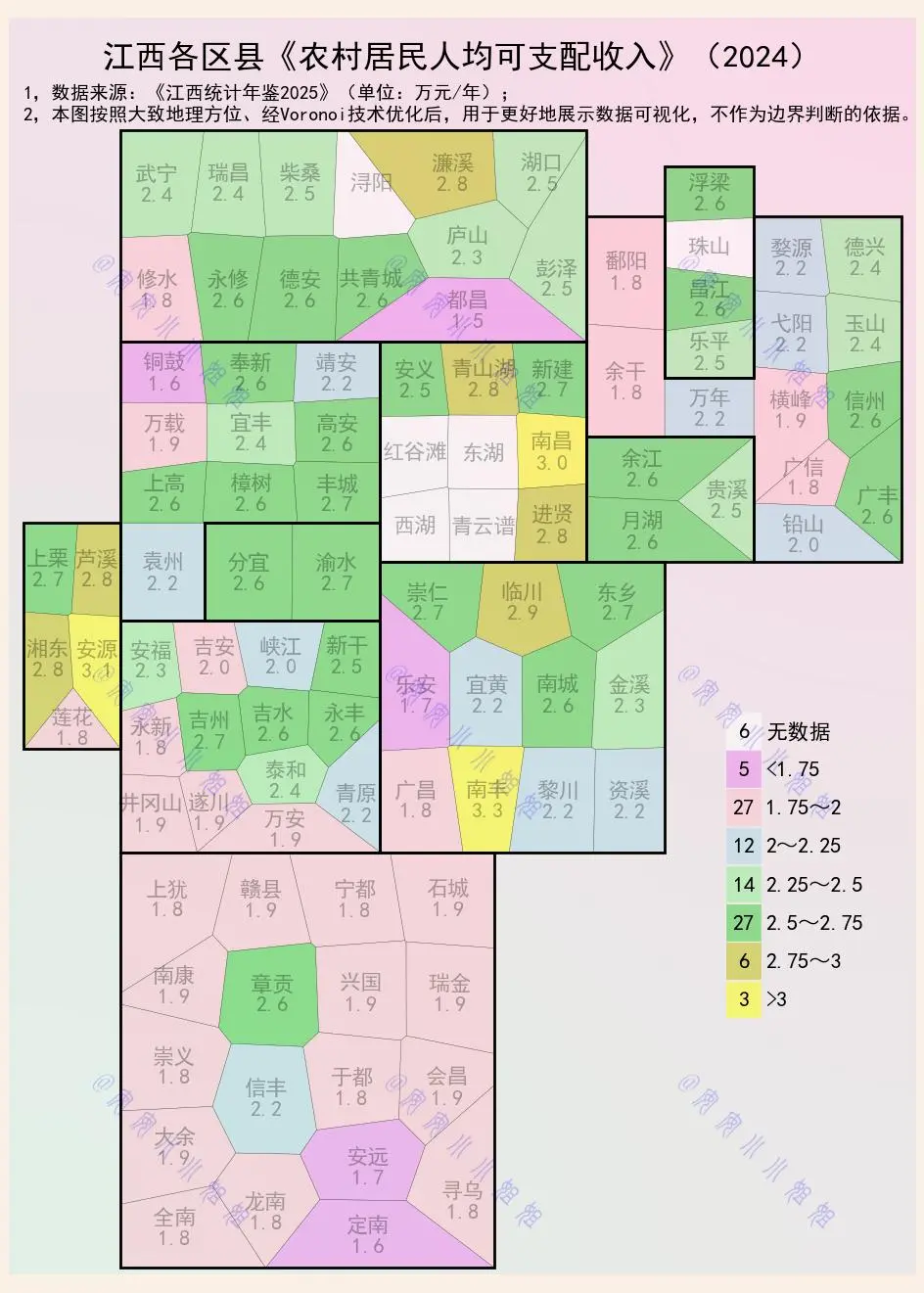 具体来看,收入在 2.5 万元至 2.75 万元之间的区县数量最多,达到了 27 个,主要分布在九江、景德镇、宜春、抚州等地。这些区县大多位于交通便利、产业基础较好的区域,农村经济发展相对活跃。
