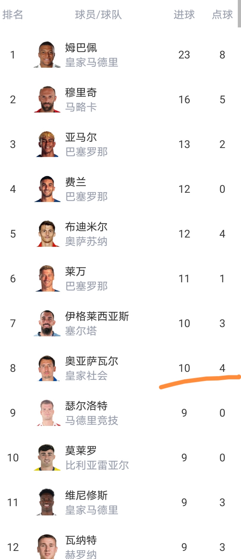 射手榜8人进球上双,仅穆里奇一人逼近姆巴佩。