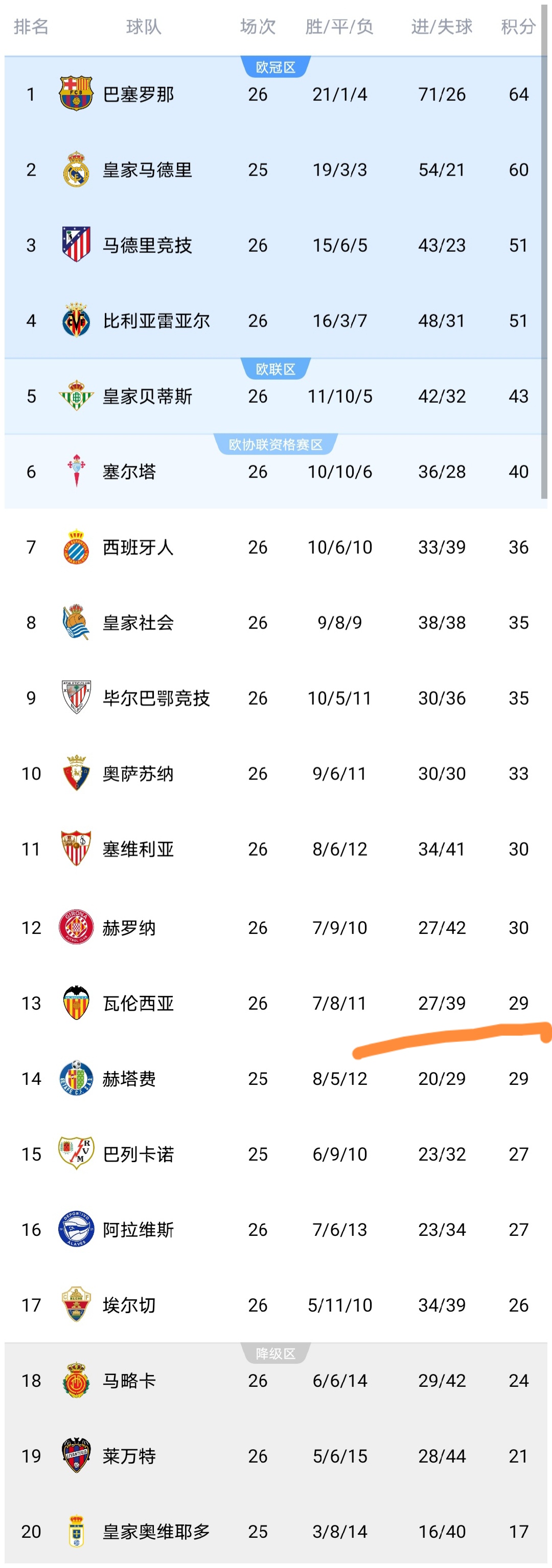 可以西班牙人队遭阻击之后,积分仅上涨到36分,排名第7,落后第6的塞尔塔队4分,而埃尔切拿到1分之后,积分上涨到了26分,领先降级区2分。而瓦伦西亚击败奥萨苏纳队之后,积分上涨到了29分,暂时领先降级区5分,瓦伦西亚队保级希望大增,而奥萨苏纳输球之后,积分停留在了33分,排名第10。此外皇家贝蒂斯遭逼平之后,积分仅上涨到43分,落后第4的比利亚雷亚尔队8分之多,而塞维利亚队赛后的积分上涨到30分,领先降级区6分,塞维利亚队保级压力暂时小了很多。而塞尔塔击败赫罗纳之后,积分上涨到了40分,逼近前五了。