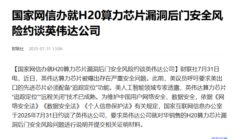 据知情人士透露,国家网信办近日召集英伟达相关高层进行闭门会议,要求该公司对H20芯片中是否存在“后门”、监控模块或远程关闭功能进行详细解释。这一会议意在厘清英伟达芯片是否存在未经用户授权的隐蔽机制,是否具备可以向境外传输用户数据、技术信息的功能,以及是否允许美国政府远程干预设备运行。