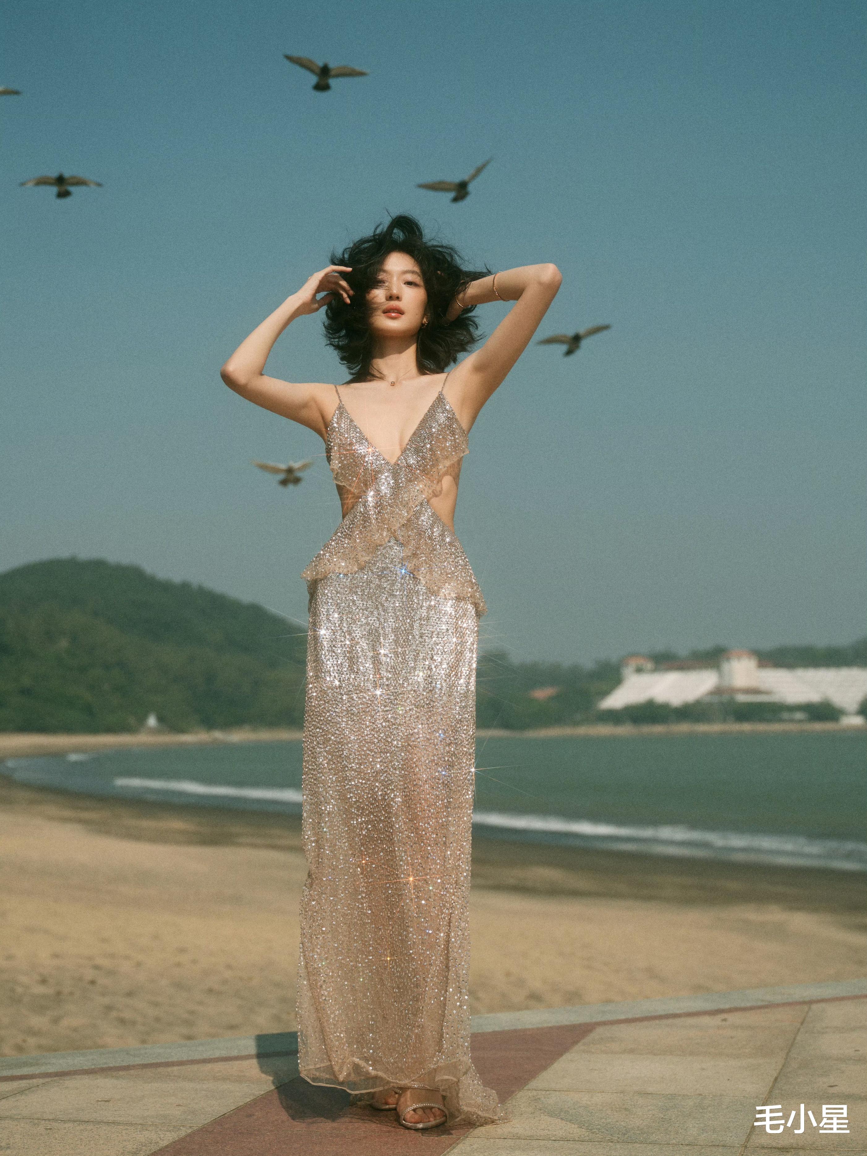 在海边的大背景下,飞鸟都来给她当 “气氛组” 。