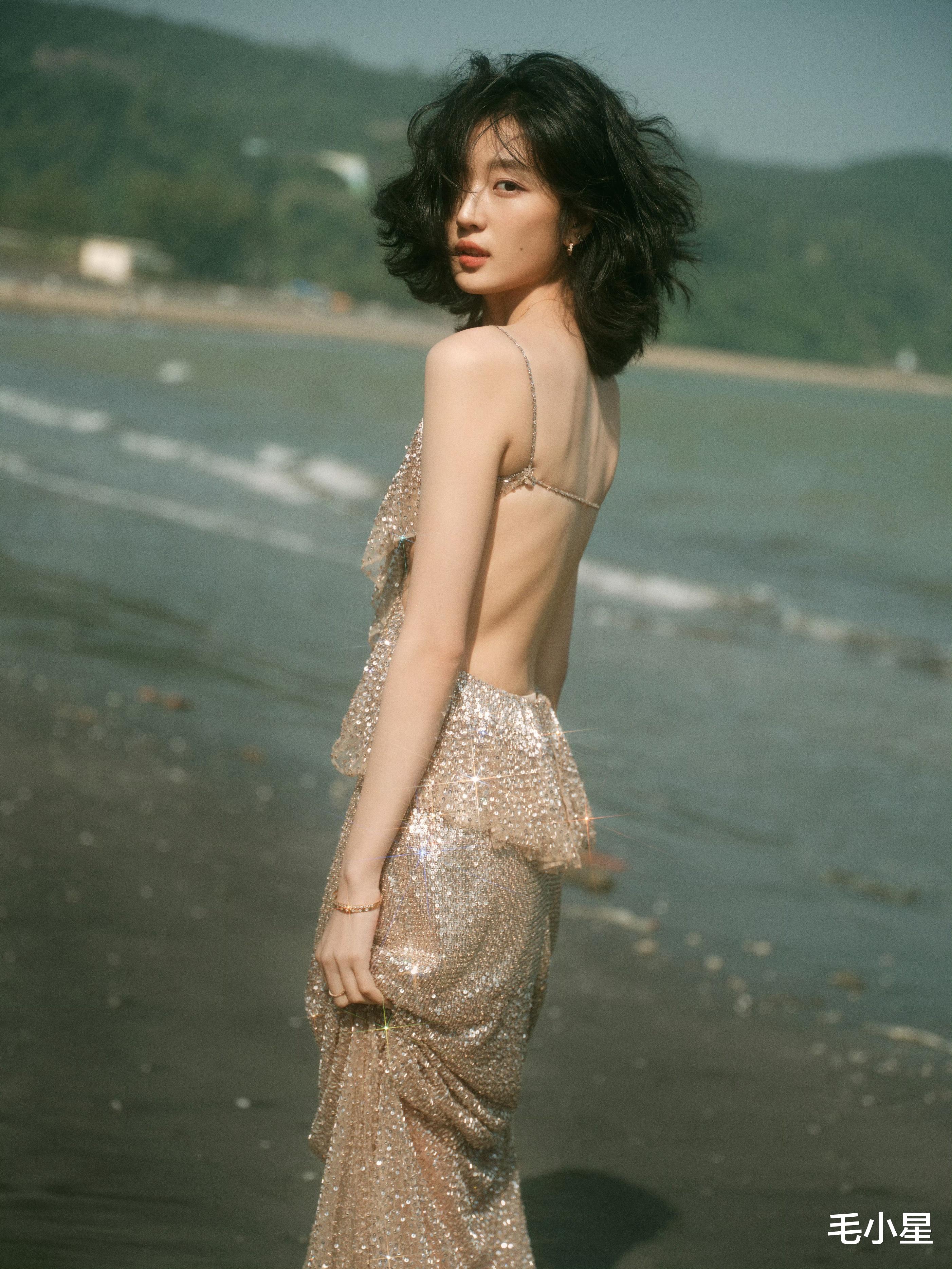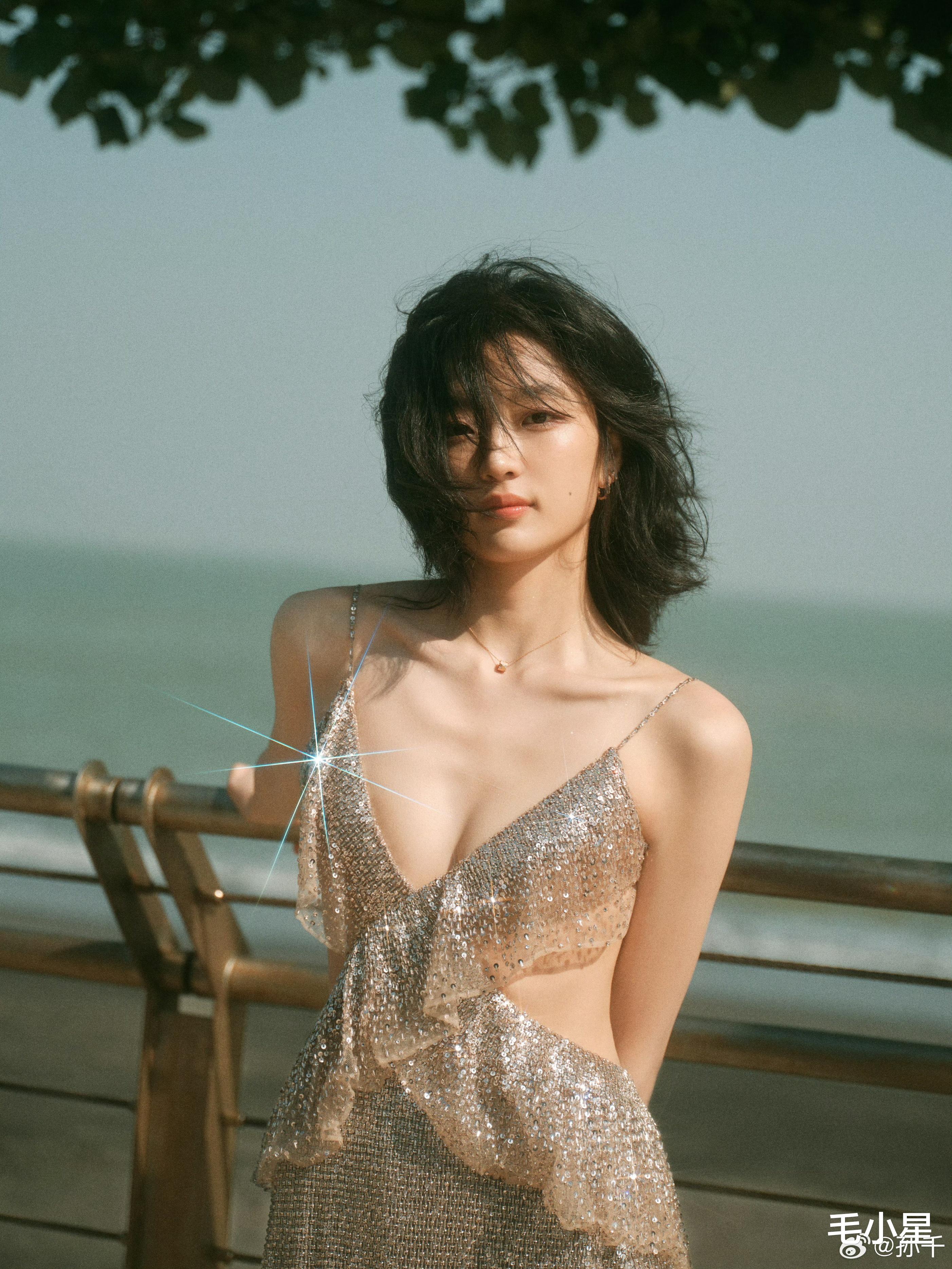 再看她身上的吊带长裙,亮闪闪的,仿佛把整个宇宙的星光都缝了上去,妥妥的 “焦点制造机”。
