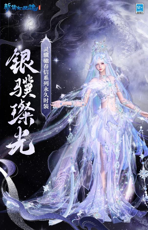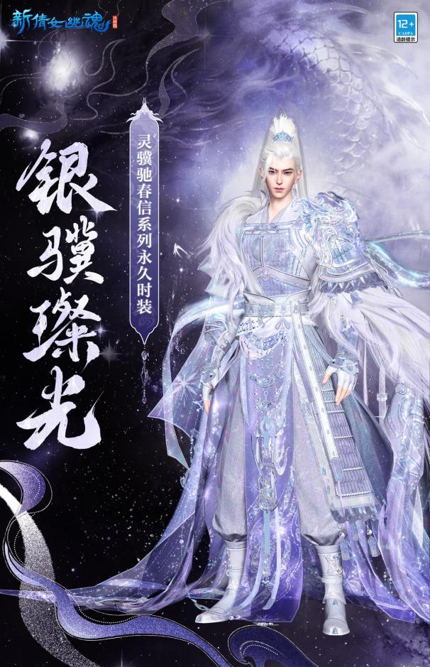 可以说,灵骥驰春信系列外观一上线,就戳中了不少玩家的审美!而且两款时装风格迥异,大家可随意挑选。银骥照夜妥妥是仙气与飒爽的结合体,男款银白华服缀着流光铠甲,银丝绣就的纹路藏着星河意境,搭配利落高马尾,行走间自带“银鞍照白马”的侠客气场。女款则是高马尾配半遮面甲,露腰渐变裙摆层叠铺开,广袖挥动时星芒流转,既有江湖儿女的洒脱,又藏着几分灵动婉约。