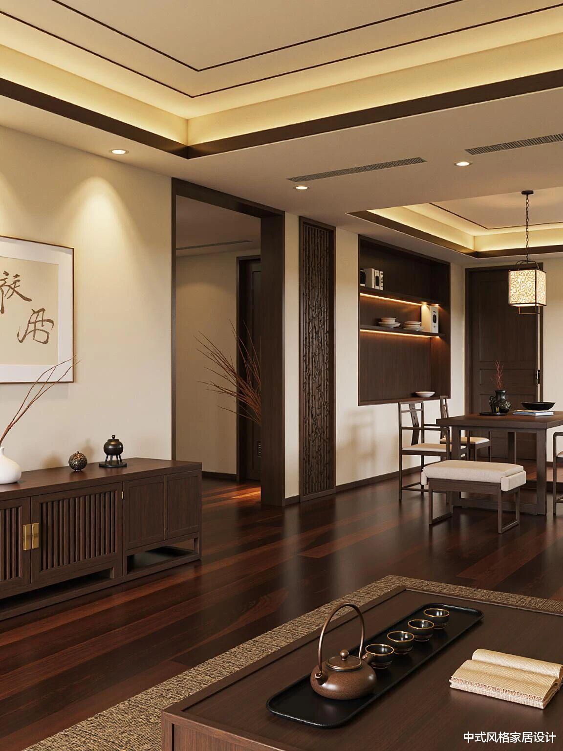 客厅整体温润雅致。深色实木地板搭配米白墙面,顶部木质格栅吊顶嵌入暖光灯带,光影层次分明。墙面挂有书法字画,旁置深色博古架,架上摆件错落有致;右侧为开放式饮茶区,原木餐桌配藤编吊灯,暖意融融。中央茶几上,铜制茶壶与青瓷茶杯置于黑檀木托盘中,与素色坐垫相映成趣,尽显东方美学的沉静与内敛。