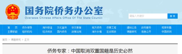 国务院侨务办公室:2015年5月4日,《侨务专家:中国取消双重国籍是历史必然》