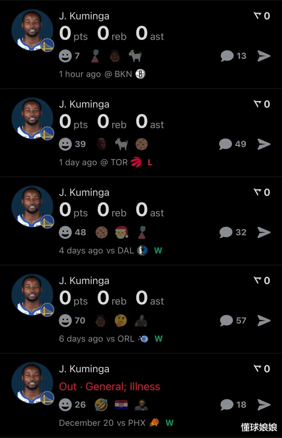 在此之前,库明加已经被连续DNP了6场。