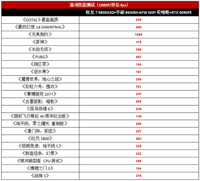 在实战测试环节,我们用锐龙7 9800X3D、RTX 4090FE显卡、DDR5 6000内存和华硕B650M-AYW WIFI哎呦喂主板搭配打造出一套高性能的独显游戏平台,主要对主板的游戏性能进行测试。