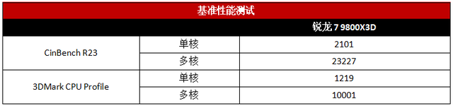 在基准软件测试中,锐龙7 9800X3D的表现同样不错,比如《Cinebench R23》单核成绩为2101分,多核成绩为23227分,与我们之前测试的成绩相比,并无多大差异,表明CPU充分释放出了其性能。