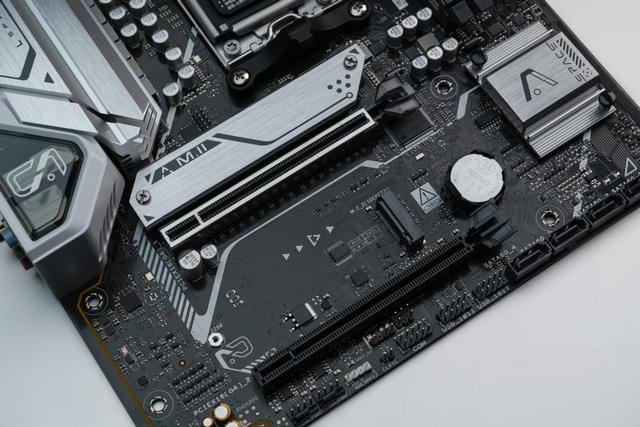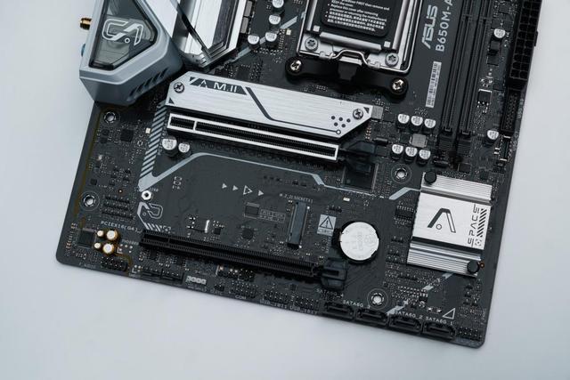 至于扩展能力,华硕B650M-AYW WIFI哎呦喂提供了1条PCIe 4.0×16规格的显卡插槽,通过合金装甲进行了加固,提升了显卡插槽的稳定性。另一条未有合金装甲覆盖的显卡插槽则为PCIe 4.0×4的规格。同时主板提供了2个M.2 SSD,其中靠近CPU插槽覆盖有散热片的为支持PCIe 5.0×4,另一条则为PCIe 4.0×4,能满足用户对于高性能SSD的安装需求。
