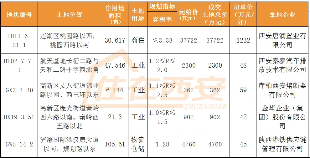 地块起始价37722万元,成交总价37722万元,亩单价1230万元/亩,楼面地价约5550元/㎡,竞得企业为西安唐润置业有限公司。