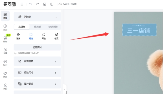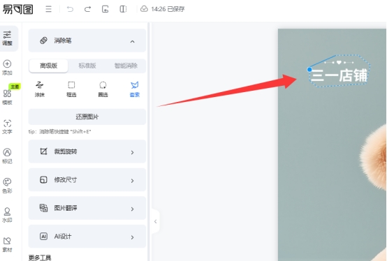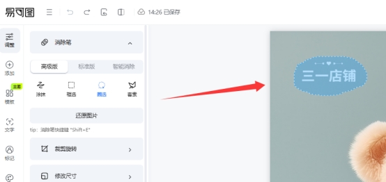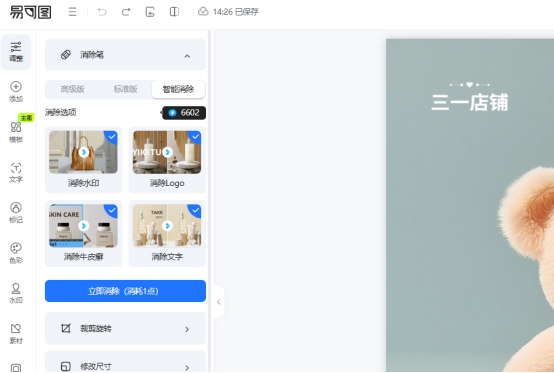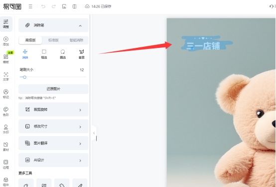 这个模式可以自动识别水印或文字区域进行消除,处理每张图片需要消耗一个易点,但好处是不需要手动选区。2、高级版与极速版的消除笔类型