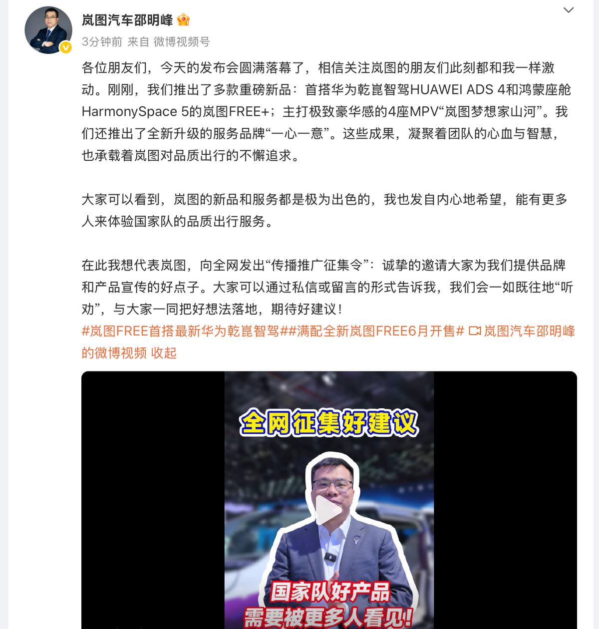 这一策略与岚图近期的动作一脉相承。4月以来,岚图第20万辆整车下线、L3智能架构发布、服务品牌升级等系列举措,均指向品牌在智能化与用户运营上的全面发力。而此次营销征集令的发布,不仅是对传统车企营销模式的突破,更凸显了岚图以用户为中心的经营理念。