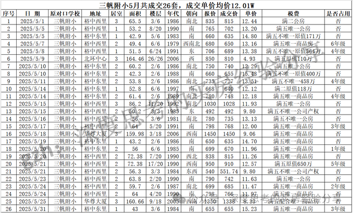 三帆附小5月份成交26套,均价12w,3月份成交了30套,均价13.21w