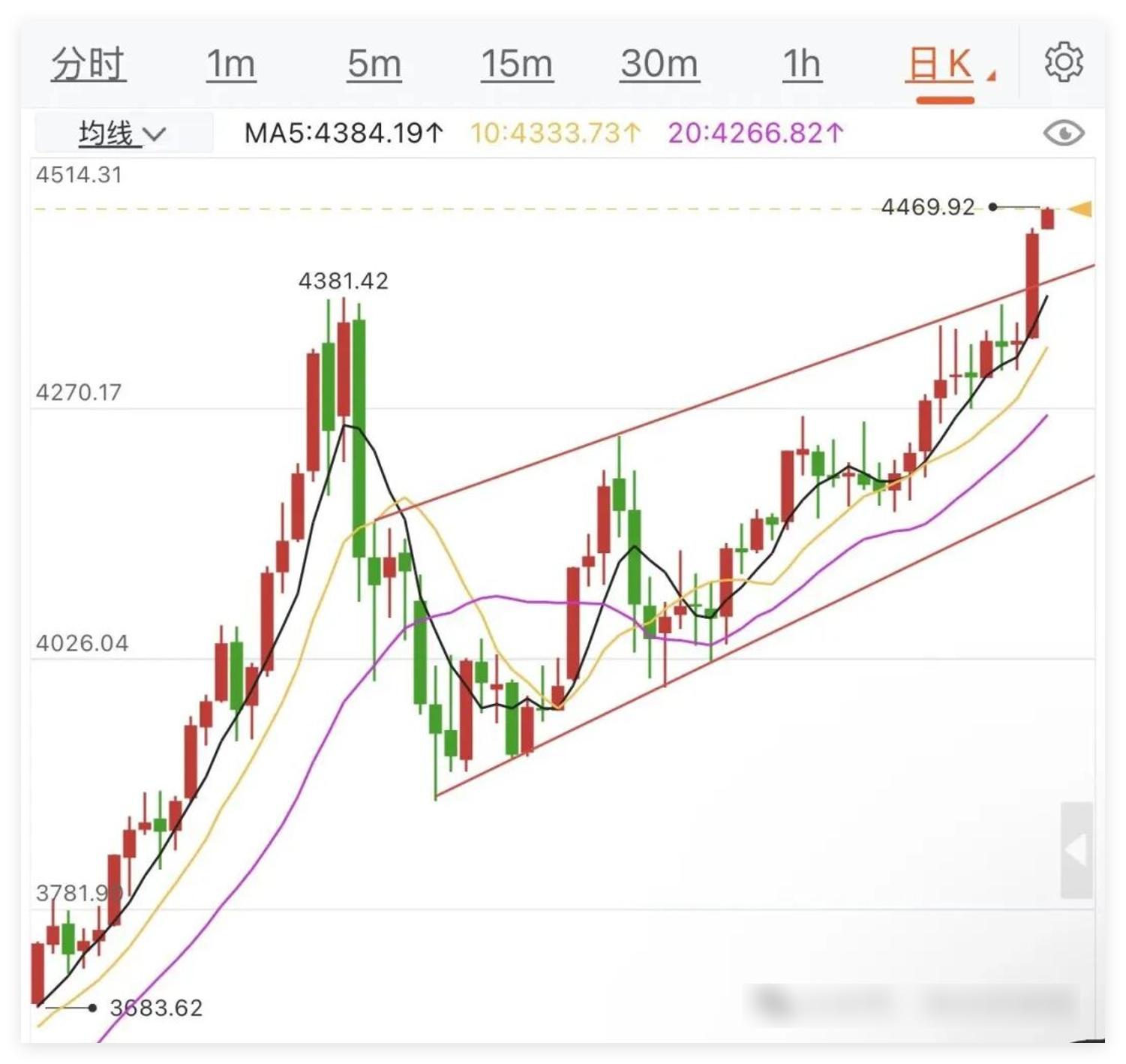 今日日内来看,继续保持多头看涨,历史新高突破后,多头会运行一段时间。日内支撑方面,4440-45区域构成短期支撑,之上多头保持强势;重点支撑4415-10区域,一切回落不下这里都是多头,下破短期转空;然后下方4380-70区域顶底转换支撑是重点。操作上,杠杆产品继续低多,出现明显空头信号或者趋势转向前不空。非杠杆产品积存金等错过了这轮多头;尽量不追,追高风险大,也只能短线。实物金,年为单位持有,不折腾!