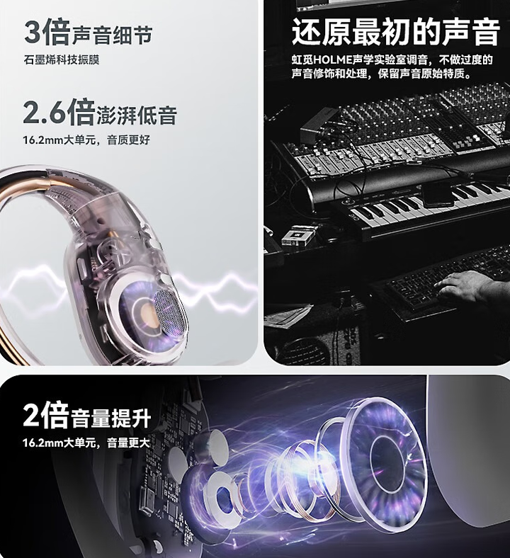 作为一个耳机控,为家里人买过的耳机,入耳、头戴、挂耳式都堆了不少了,但总觉得有的戴久了耳朵闷,有的运动时容易手动。前段时间入手了虹觅 HOLME Ultra 这款开放式挂耳耳机,经过一段时间的使用,感觉找到真正贴合日常需求的高性价比款色,于是也和大家分享一下体验。