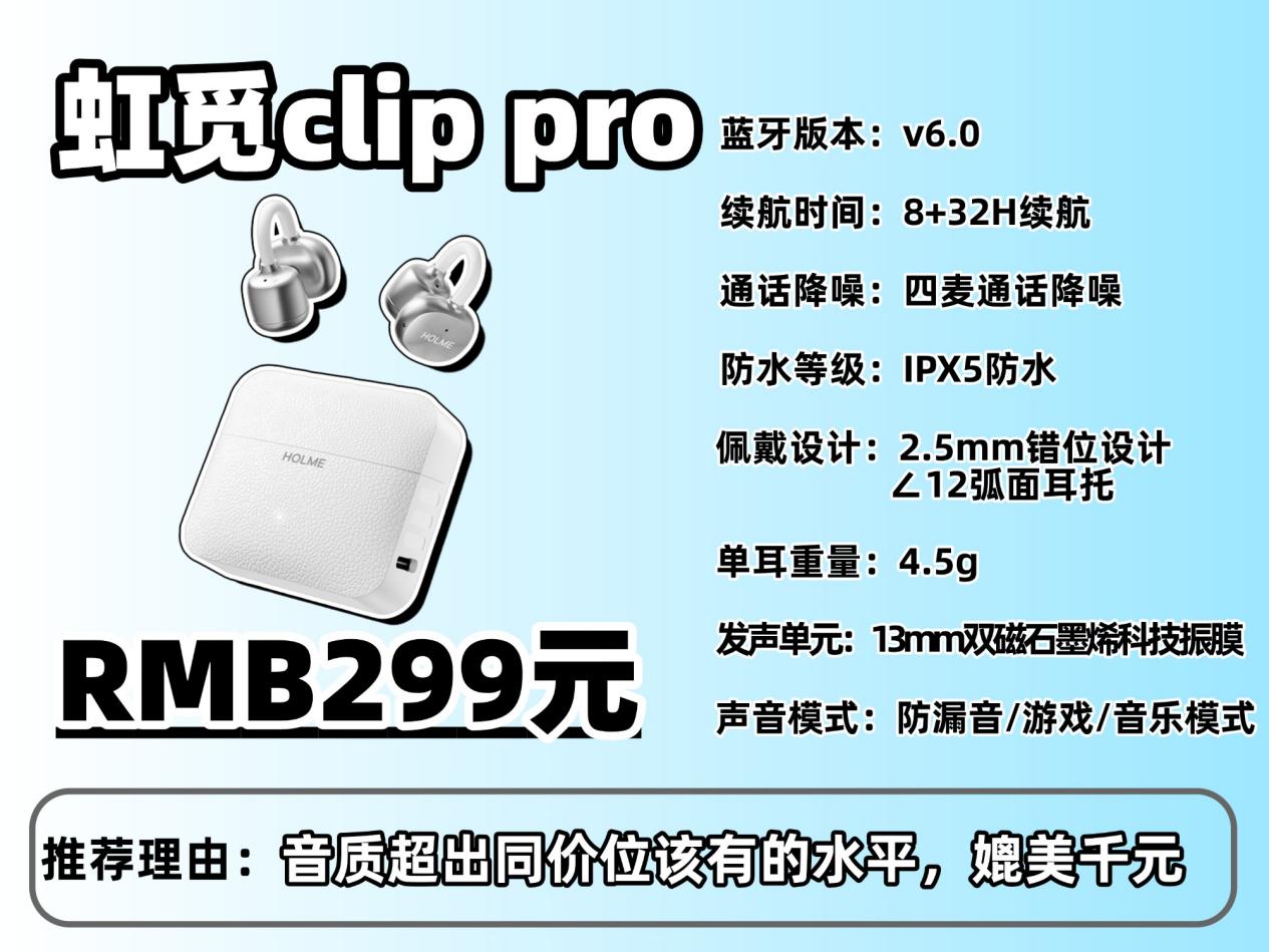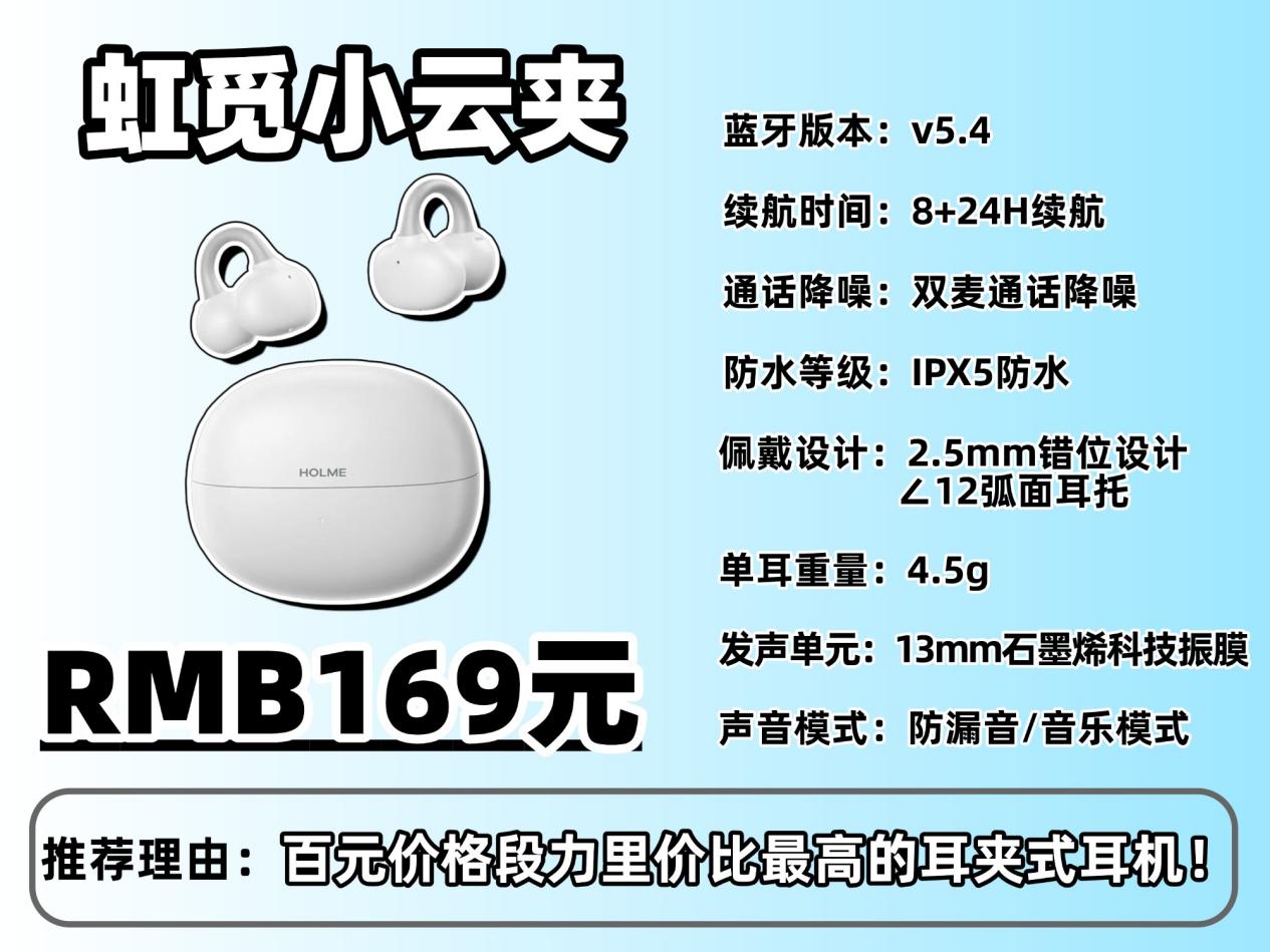 虹觅小云夹是百元价位性能标杆的存在。耳机配备了虹觅自研的防漏音模式!只要开启这个模式,就能通过反向声波抵消技术减少百分之九十八的漏音情况,非常高效的解决了开放式耳机漏音的问题。耳机还支持HBC智慧双联,左右耳可以分别连接两台不同的设备,将一副耳机当成两副用,极大的提高了使用效率。耳机配置了最新的蓝牙5.4芯片,提供了更稳定高效的连接。耳机还支持通话降噪功能,8+24小时的续航能力和IPX5的防水性能,功能性十分全面,整体来看这款耳机的性价比是非常的高!