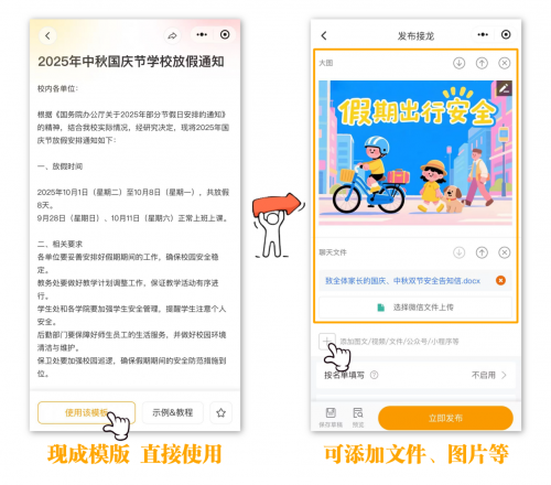 若有现成文档,可直接使用【文件签字】功能,上传文档,在线收集家长签字;