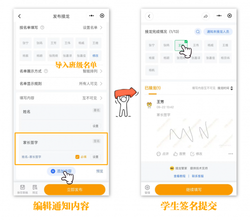 这样,家长点击姓名接龙后,名单自动亮起,无需老师挨个手动核对;