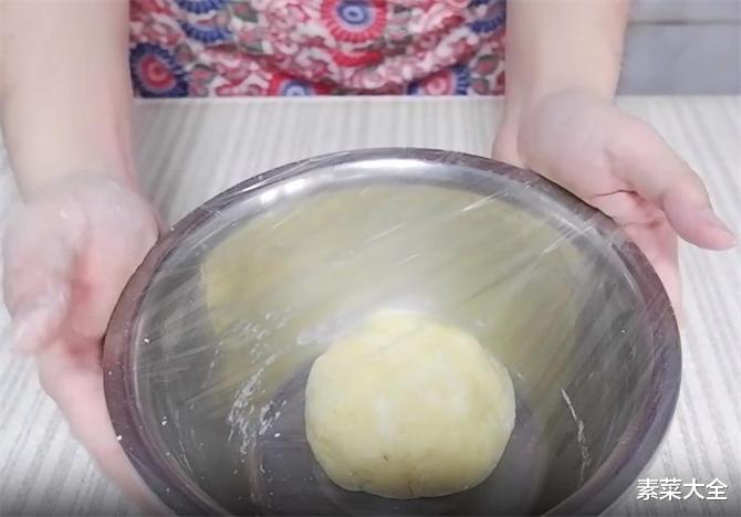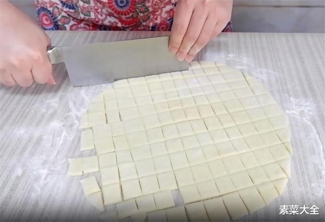 2.醒发好之后,我们再把它揉一下,把气泡揉出去,然后把面团擀成饼,饼的厚度在7毫米左右就差不多了,接着再用刀切成小方块。