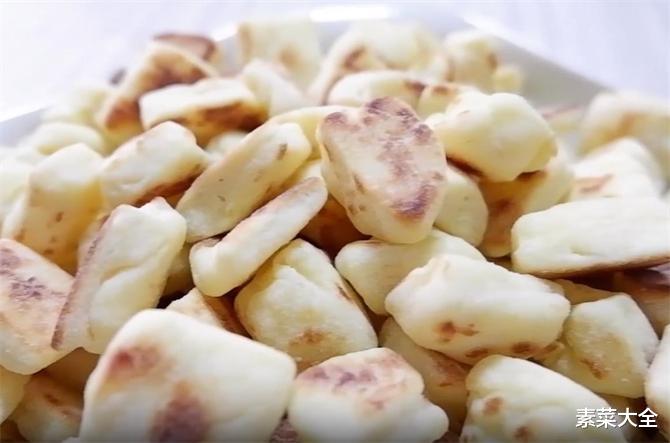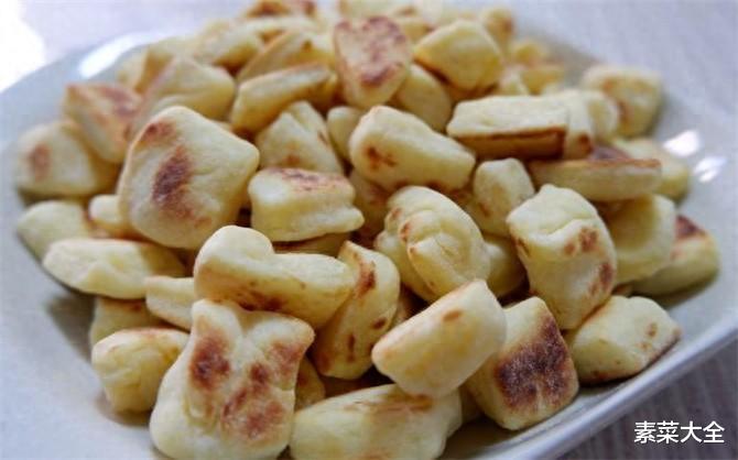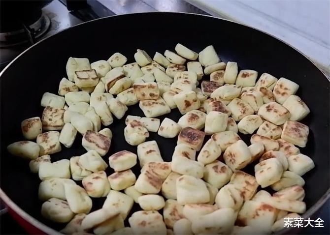 3.然后用平底锅加入少量的油,油热后下入面块,一直用小火煎,不断的翻炒,等到面块起发熟透,像这样就可以出锅了。