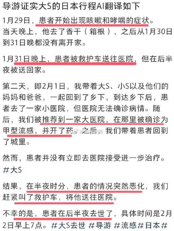 按照导游的说法,如果大S在医院接受治疗,可能不至于走到这一步,但他们没有,导致中间错失了黄金救治机会。