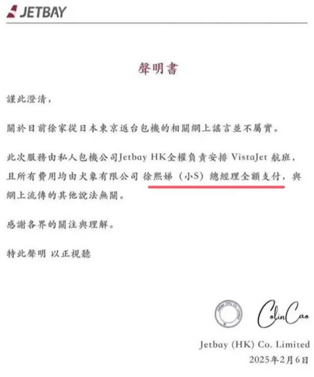 私人飞机公司也发文称:徐家从日本东京包机返台的所有费用皆由徐熙娣全额支付。