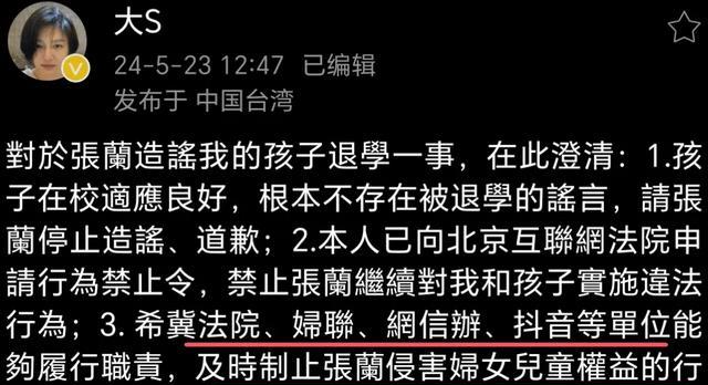 当初大S希望各平台和机构能制止张兰,如今迟到了七个月,好歹到了。