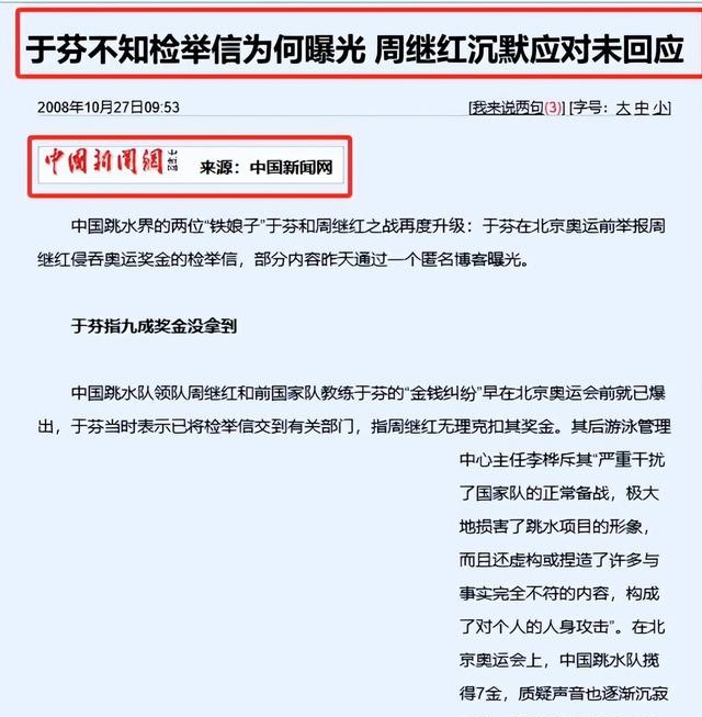 2008年奥运前夕,同样为国家队输送了多名优秀选手的资深跳水运动员于芬在检举信中,直指周继红无理克扣奖金。