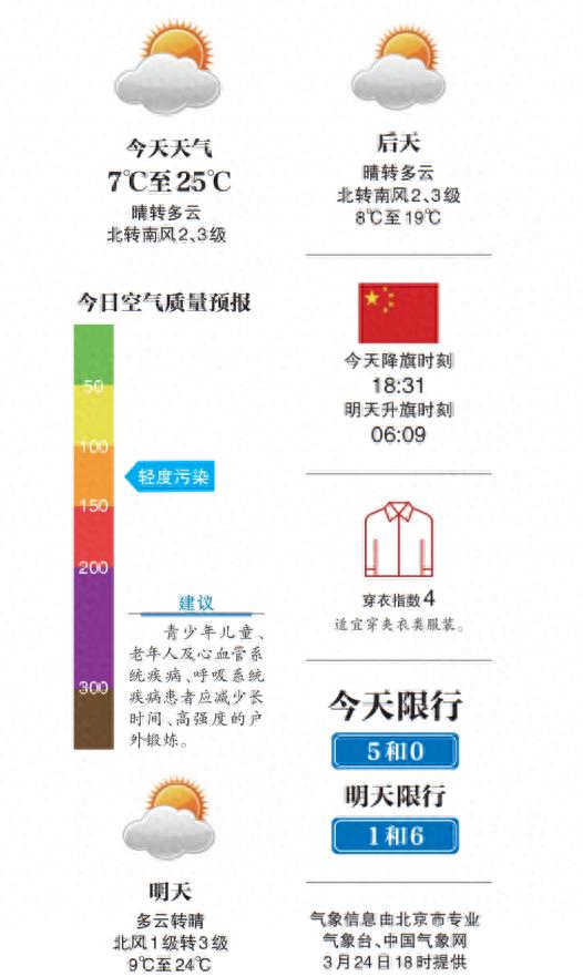 据“气象北京”消息,今天(3月25日)白天晴间多云,有轻雾,北转南风二三级,最高气温25℃;夜间晴转多云,有轻雾,南转北风一二级。今天有轻雾,能见度不佳,驾车出行注意交通安全;昼夜温差较大,请注意适当调整着装。