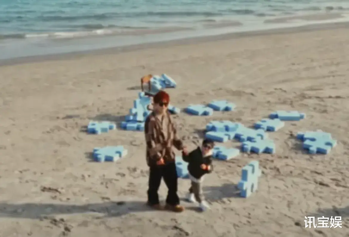父子俩在沙滩上大手牵小手一起走,苏醒穿着单薄外套,小小苏则穿上了棉服。二人这天生的镜头感,很自然的就对上了航拍的无人机。