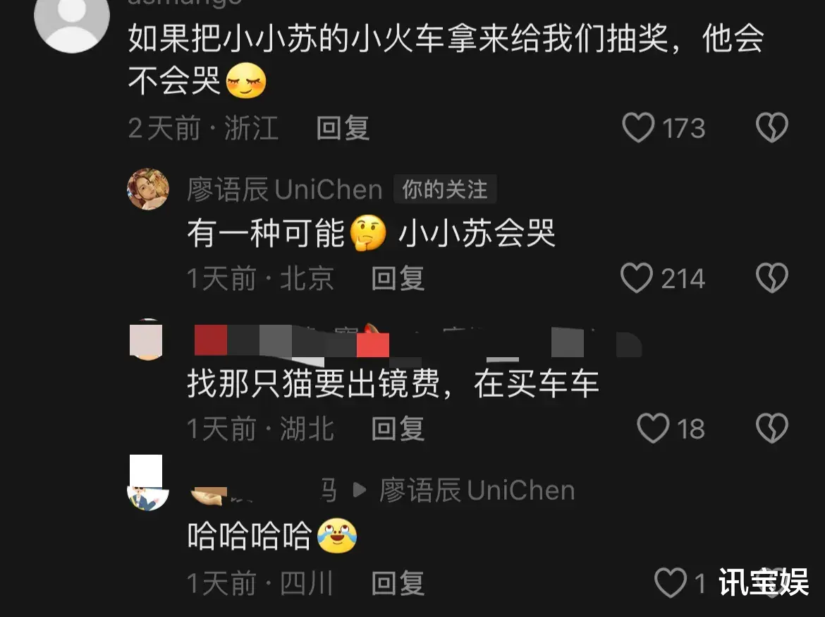 有网友说如果把小小苏手里的小火车拿来抽奖,他会不会哭。亲妈廖语辰还在线回复:有一种可能,小小苏会哭。哈哈哈,当妈妈的是最懂宝宝心思的。
