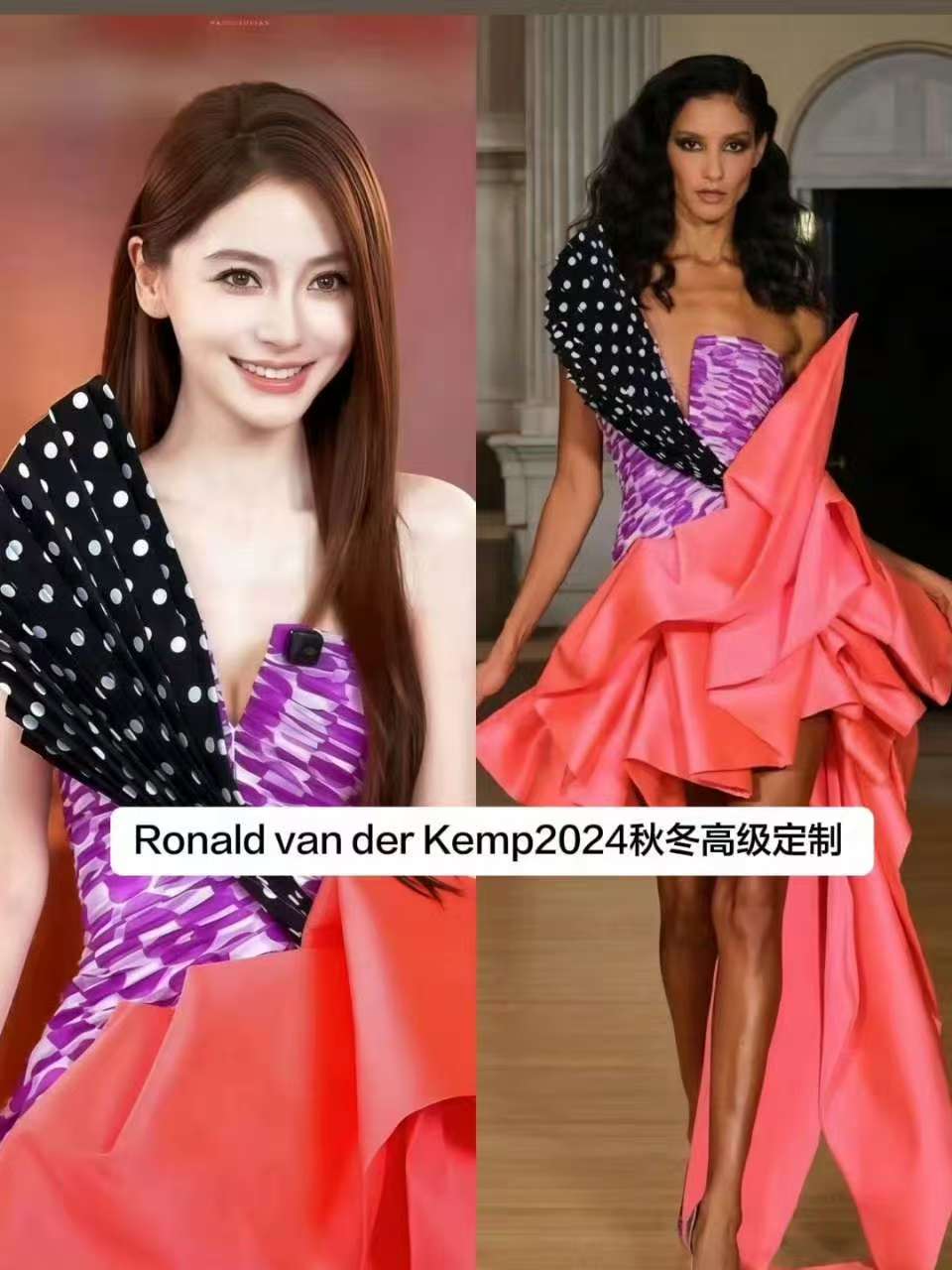 当镜头对准直播间的中心,Angelababy身着Ronald van der Kemp 2024秋冬高级定制裙装亮相的瞬间,仿佛一道连接过去与现在的时空裂隙被悄然打开。紫粉撞色的抹胸设计大胆而明艳,复古波点肩带与珊瑚红层叠裙摆相互映衬,这不仅是色彩美学的胜利,更是一场关于“美”的盛大宣言。作为与该品牌第八次携手的高定合作,这套裙装不仅标志着个人演绎高定总数突破140套的行业里程碑,更以一种近乎宣言的姿态,宣告了“内娱高定女王”地位的不可撼动。她站在那里,本身就是一部行走的时尚史。