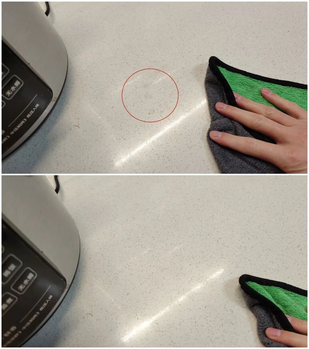 事实:优质石英石的表面经过高压致密处理,吸水率极低,只要不是长时间停留,基本不会渗色;如果真像网文说的那样,那么石英石台面作为“国民级”台面,恐怕家家户户的厨房台面都是泛黄的了。