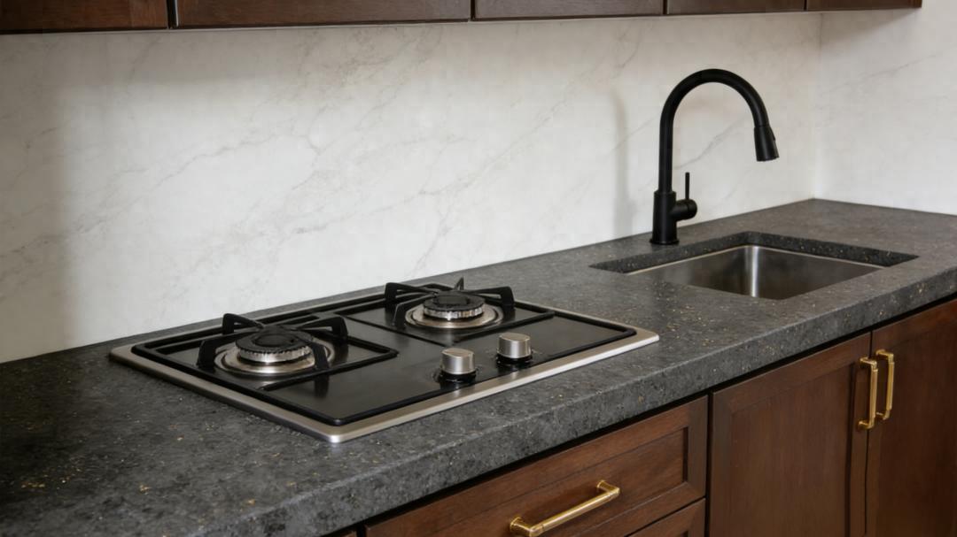 事实:石英石的主要成分是石英砂(90%+)和树脂,物理强度很高,正常使用下几乎不会开裂。真正导致开裂的,大多是可规避的人为因素——①选择密度高、品牌可靠的石英石。②确保地柜框架水平、稳固,为台面提供均匀支撑。③对关键受力区(如灶台、水槽四周、切菜区)进行加固。