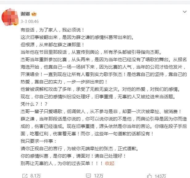 先说谢娜。3月3日,她发了一篇长文,直接点名薛之谦,要求他为多年前吐槽张杰的言论道歉。