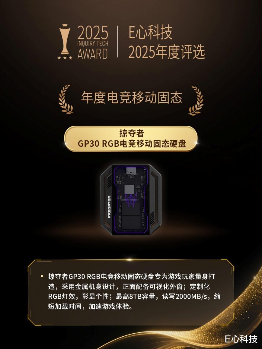 在2025年度评选中,掠夺者GP30 RGB电竞移动固态硬盘被评为“年度电竞移动固态硬盘”。