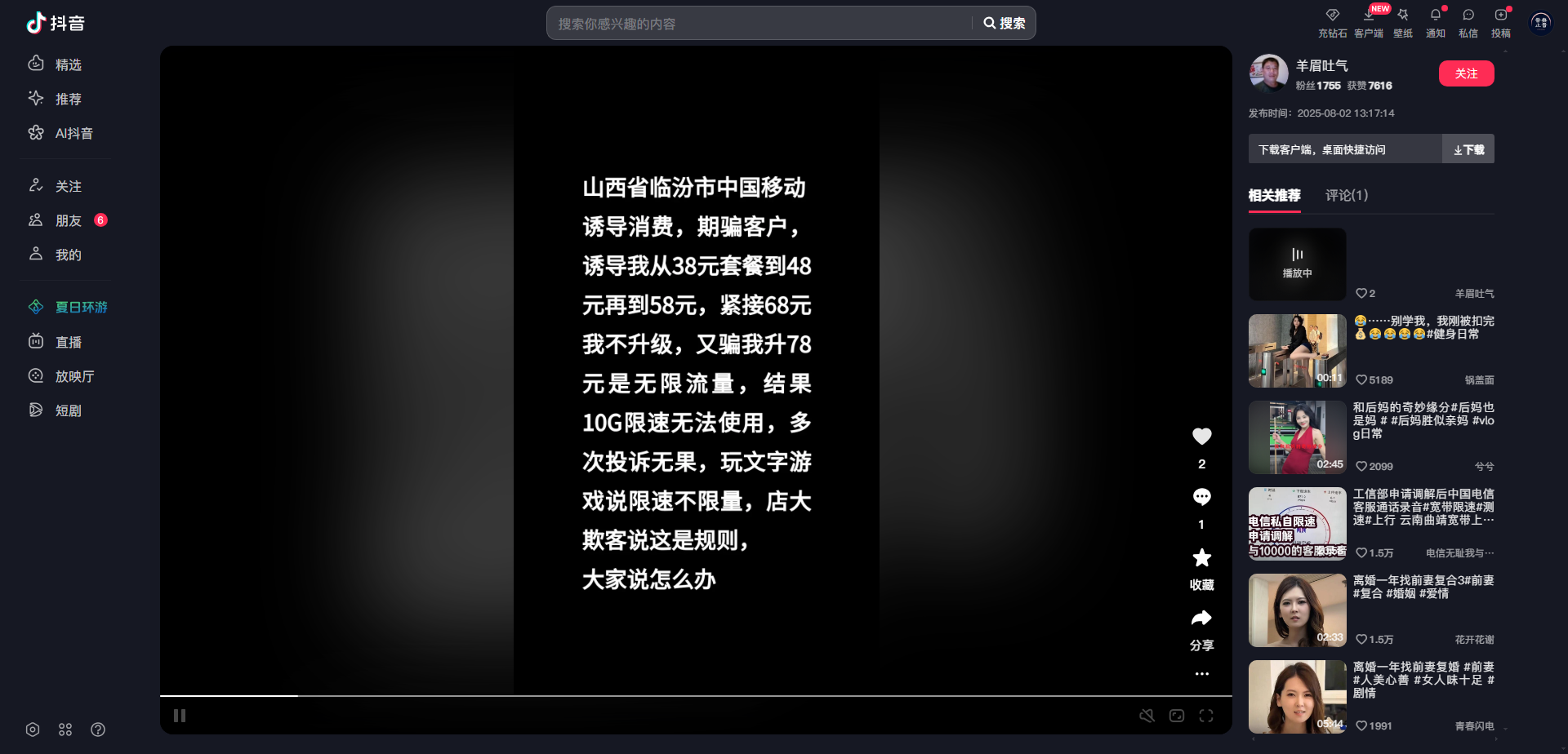 视频发布后,其他用户表示有类似经历,指责中国移动在套餐推销和服务上存在诸多问题。有网友表示,自己也曾被诱导办理高价套餐,实际体验却与宣传相差甚远;也有网友呼吁加强对通信运营商的监管,保护消费者的合法权益。
