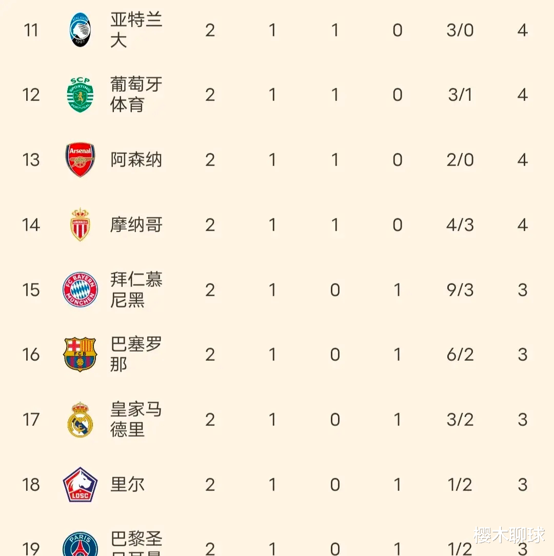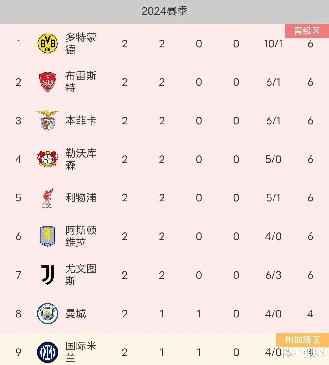 欧冠战场堪称冷门之夜,两大超级豪门皇家马德里与拜仁慕尼黑一起输球,皇马客场0-1不敌里尔,拜仁客场0-1不敌阿斯顿维拉,此外,马德里竞技客场0-4惨败给了本菲卡,目前皇马排名第17,拜仁排名第15,他们中间是排名第16的巴萨,马竞排名第23,欧冠两轮战罢,多特蒙德、布雷斯特、本菲卡、勒沃库森、利物浦、阿斯顿维拉、尤文图斯7支球队取得了两连胜,联赛阶段比赛总共就8场,这7支球队已经抢得了先机!