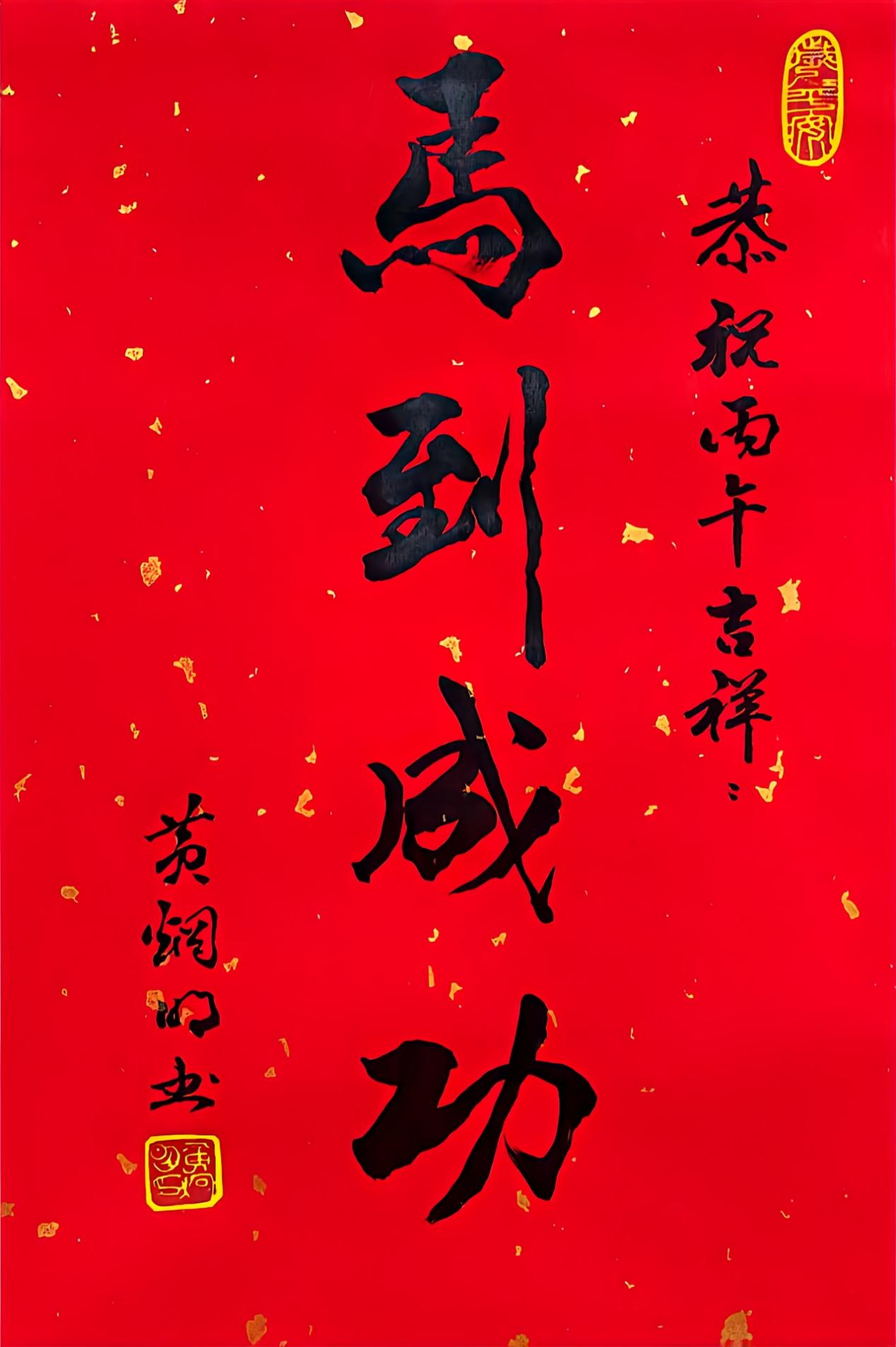 “马到成功,旗开得胜。”寥寥八字,既是对丙午马年的美好期许,也是中华民族自古以来对顺遂如意的共同追求。《马到成功》这幅作品的笔法沉稳庄重,起笔收笔利落有度,无丝毫拖沓之感,尽显黄炯明扎实的楷书功底——横画挺拔舒展,竖画刚劲有力,撇捺舒展大气,将“马”的昂扬之势、“成”的沉稳之态、“功”的厚重之感,通过笔墨精准传递。字形结构严谨规整,疏密排布恰到好处,既遵循楷书的端庄方正之态,又融入行书的灵动之气,避免了楷书的刻板生硬。作品采用红色底纹搭配黑色墨字,红黑对比鲜明,既契合新年的喜庆氛围,又彰显出传统祈福文化的厚重感,笔墨间的沉稳与底色的热烈相互映衬,既传递出“策马扬鞭、万事顺遂”的豪迈气概,也让传统书法的实用性与艺术性得到完美展现。
