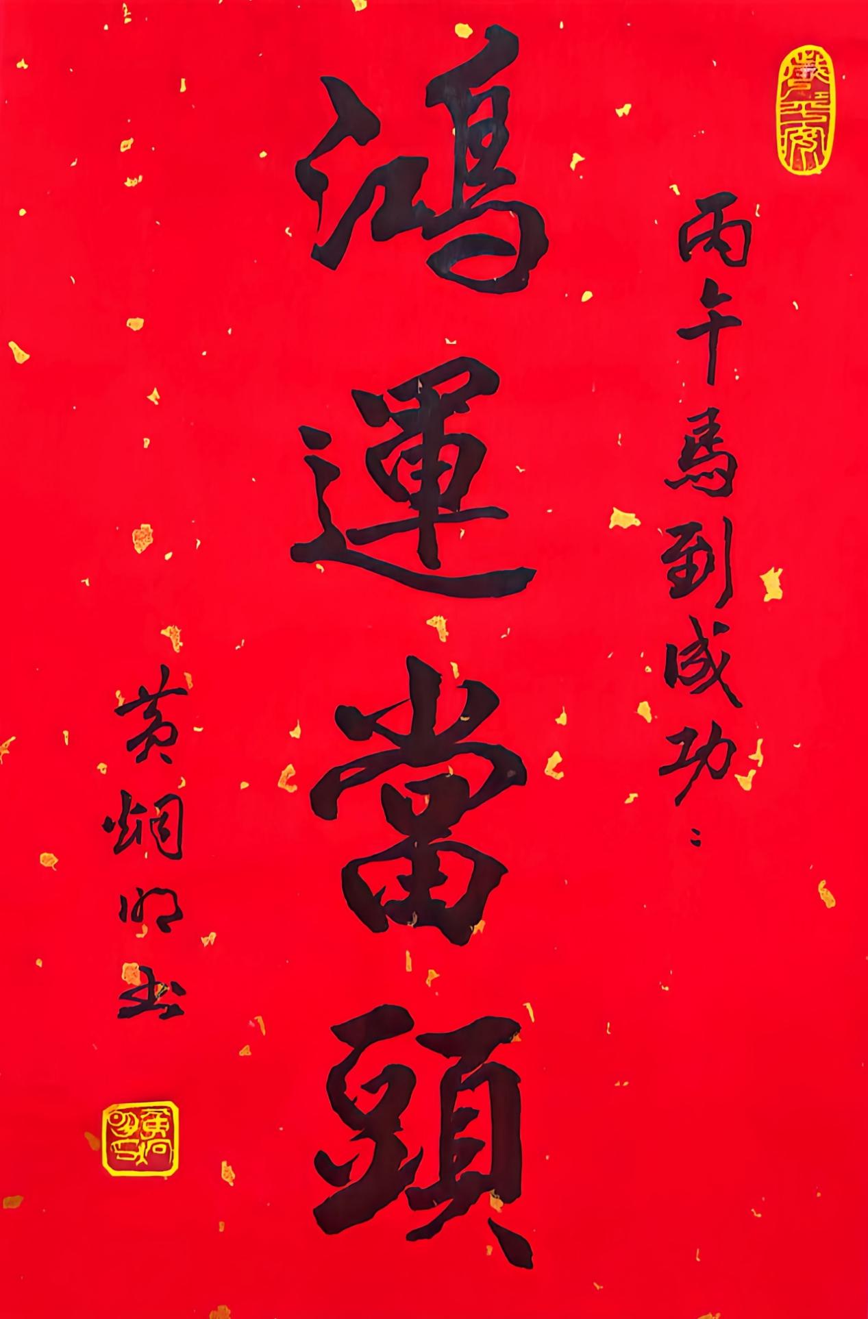 “鸿运当头,吉星高照”,是新年最具代表性的祈福话语,直白而真挚,寄托着人们对新一年福运降临、万事顺意的美好向往。《鸿运当头》这幅作品的笔力遒劲有力,笔锋灵动洒脱,字形大气开张,尽显黄炯明行书的精湛技艺——笔画粗细变化自然,墨色浓淡相间,既有“力透纸背”的厚重感,又有“行云流水”的灵动之态。“鸿”字舒展大气,笔画舒展如鸿雁展翅,尽显豪迈之气;“运”字婉转灵动,笔画衔接自然,传递出福运流转的灵动之感;“当”“头”二字沉稳有力,与前两字的舒展形成呼应,整体字形错落有致,布局开阔大气。作品同样采用红色背景,进一步强化了新年的喜庆氛围,笔墨的遒劲与底色的热烈相得益彰,既让“鸿运当头”的寓意更加鲜明突出,又展现出黄炯明书法“大气磅礴、意蕴深远”的艺术特质,让观者在感受笔墨之美的同时,也能感受到满满的新春暖意与福运期许。