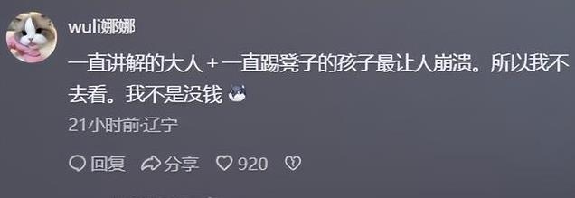 还有网友表示,现在电影院的乱象真的让人崩溃,一直讲解的大人和一直踢凳子的孩子,在场的观众都毫无观影体验。