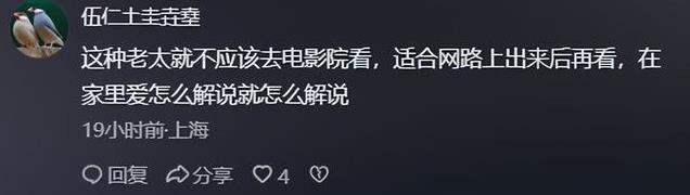 网友表示,这种老太太不应该去电影院看,应该等电影在网站上能看的时候再看,在家里想怎么解说剧透都无所谓,但电影院毕竟是公共场合。