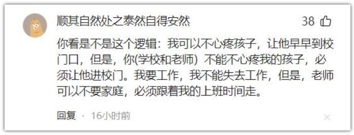 家长要求学校提前开门,固然有赶上班的现实需求,有担心孩子安全的焦虑;家长要求学校推迟到下午6:30放学的建议,固然有没有下班的考虑,但何尝没有只方便自己,苛求学校的深层心理需求?