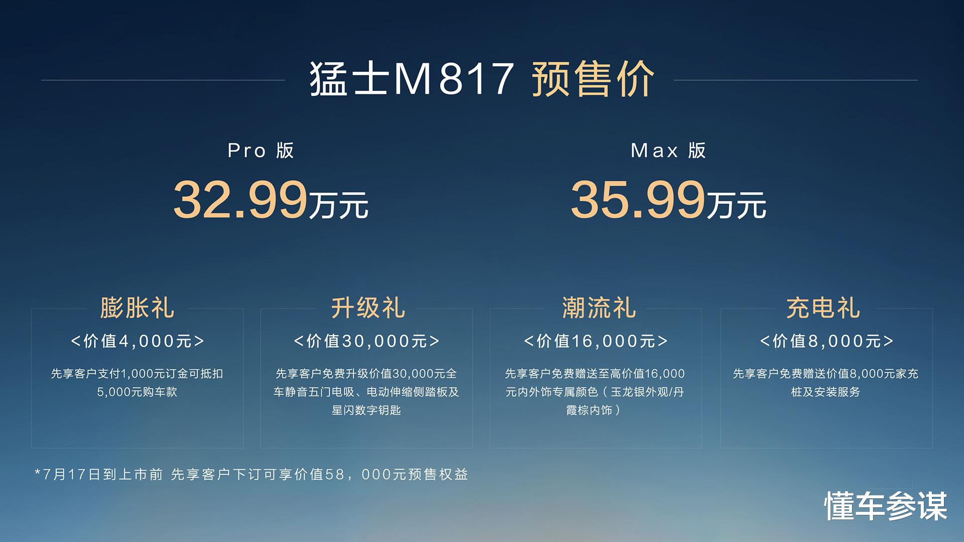猛士M817此次推出Pro版和Max版两个版本,预售价分别为32.99万和35.99万元。并且,凡从即日起到上市前下订的用户,还能享受包括4000元订金膨胀、3万元配置升级、1.6万元潮流礼包及8000元家充桩服务等在内的、价值5.8万元的限时预售权益,性价比直接拉满。