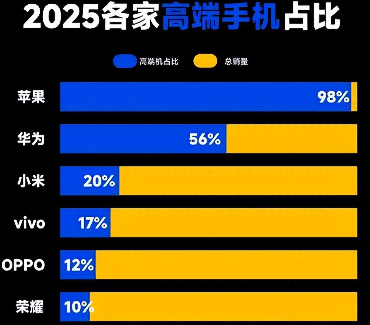 之前有机构发布了一份2025年,中国手机市场各大品牌的高端机(大于4000元的手机)占比情况。